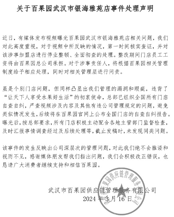 3月16日,百果园武汉微信公众号发布声明回应称,对此高度重视,对于视频中所反映的情况,第一时间核实查证,并对该涉事加盟店进行停业整顿、全面彻查的处理。整改期间门店员工工资将由百果园总公司承担。对于涉事责任人,将根据百果园相关管理制度给予相应处理,同时对相关管理层进行问责。